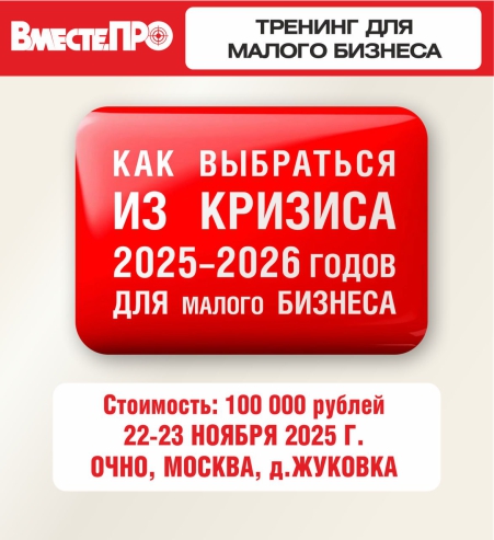 В условиях высоких кредитных ставок, растущей инфляции и давления обязательств многие предприниматели испытывают стресс, выгорание и ощущение тупика. Практический тренинг предлагает не теорию, а практическое решение – за два дня разработать персональный пошаговый план спасения бизнеса на предстоящий год. Автор и ведущая тренинга Олеся Бережная – консультант по стратегическому и антикризисному управлению с опытом работы с 2001 года. За ее плечами более 1300 реализованных проектов и успешное прохождение кризисов разных лет, включая вывод компании из технического дефолта с долгами в 13 миллиардов. Ключевые детали мероприятия: Дата: 22-23 ноября 2025 г. (суббота-воскресенье). Формат: 2-дневный очный интенсив с 11.00 до 20.00. Место: Московская область, Одинцовский район, д. Жуковка. Целевая аудитория: собственники малого бизнеса. Вместимость: эксклюзивная группа до 10 человек для максимальной глубины проработки. Стоимость участия: 100 000 рублей. Действует специальное предложение: 95 000 рублей с человека при участии с коллегой. В программе тренинга участников ждет: • Восстановление личного состояния: работа с энергией и эмоциональным интеллектом для выхода в позицию силы. • Анализ рынка и продуктовой матрицы: адаптация предложения под новые запросы потребителей. • Построение финансово-экономической модели на 2026 год: навигатор для принятия решений на основе цифр. • Эффективная работа с командой: мотивация сотрудников в условиях ограниченных ресурсов. • Оптимизация бизнес-процессов: создание стабильного потока ценности. • Формирование итогового антикризисного плана: готовый пошаговый документ для реализации. «Смысл кризиса не в том, чтобы все бросить, а в том, чтобы за текущую цену приобрести шанс начать новое и изменить ход событий, – комментирует Олеся Бережная. – Наша задача – за два интенсивных дня дать собственникам не просто знания, а сформировать антикризисный план действий, рабочие документы и, что самое важное, внутреннюю опору для решительных шагов». Каждый участник уйдет с тренинга с пакетом готовых документов: антикризисным планом, концептом финансовой модели, продуктовой матрицей и системой мотивации команды. Для получения дополнительной информации, пожалуйста, обращайтесь по контактам: https://vmestepro.group/22-23-noyabrya-trening-antikrizisnyy-plan-2026 +7 (961) 072-94-14, (495) 774-85-59 Бережной Александр, директор по развитию.