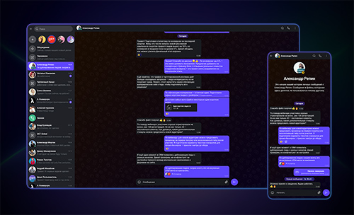 Интерфейс мессенджера сочетает удобство популярных публичных сервисов (навигация в стиле Telegram) с профессиональными инструментами командной работы, характерными для Slack: каналами, тредами, закреплёнными сообщениями и реакциями.
